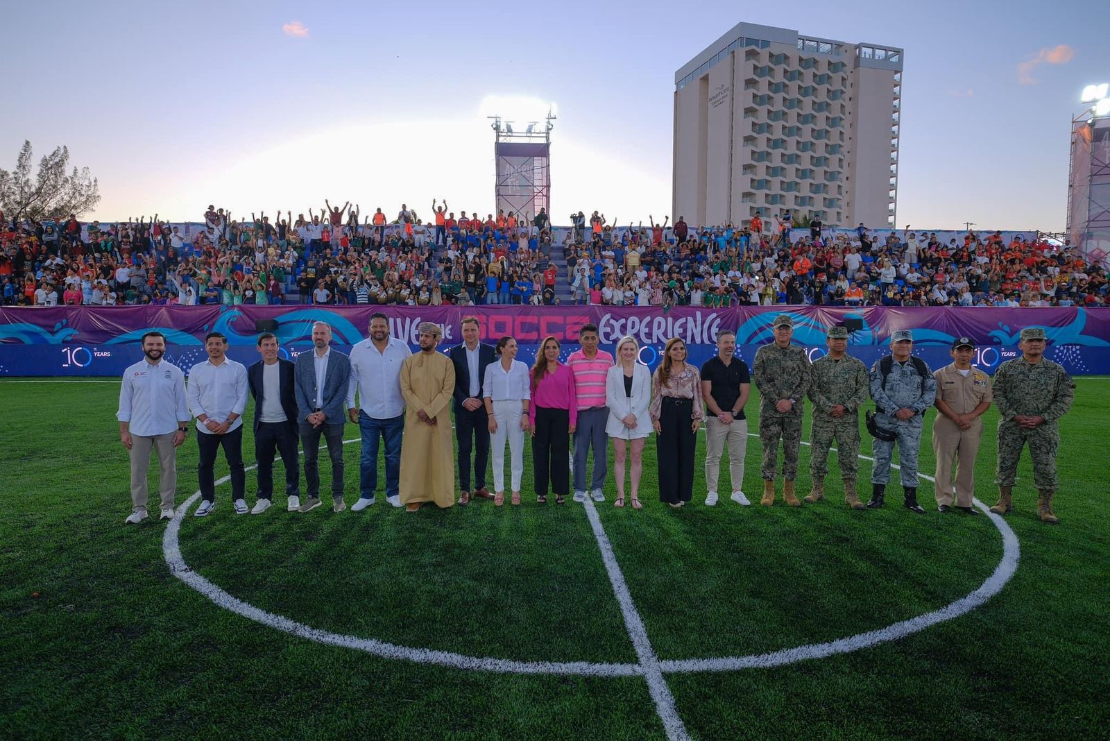 Con la presencia de Jorge Campos, ídolo del fútbol mexicano, la gobernadora de Quintana Roo dio la bienvenida a los jugadores internacionales, a sus familias, acompañantes, en un estadio con aforo para más de dos mil personas, con una inigualable vista hacia el Mar Caribe desde la zona hotelera.