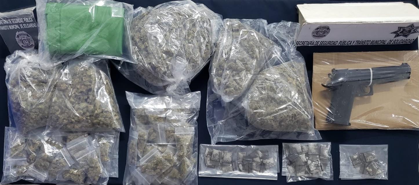 Playa del Carmen (Redacción).- La Policía Municipal de Solidaridad realizó la detención de dos sujetos en posesión de más 90 posibles dosis de diversos narcóticos y una réplica de arma de fuego en la colonia In House.