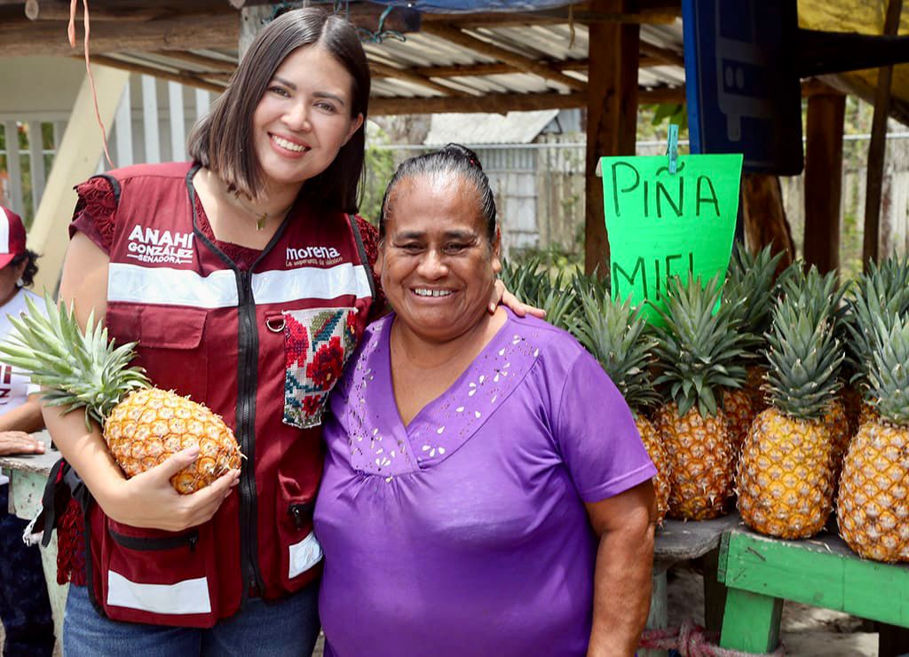 Anahí González, durante su visita a las vecinas, vecinos y productoras de piña miel, refrendó su compromiso de continuar luchando para que los programas sociales sean un derecho constitucional, siga el apoyo de fertilizantes y tengan mayor acceso a servicios de salud con el IMSS-Bienestar.