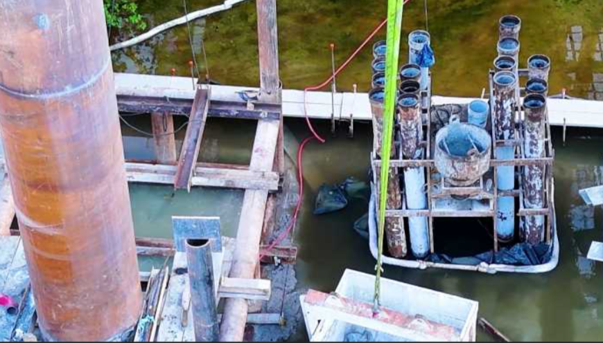 Cancún (Redacción).- A través de redes sociales, grupos ambientalistas denunciaron el derrame de cemento en la Laguna Nichupté por las obras del puente vehicular que se construye en el cuerpo de agua.